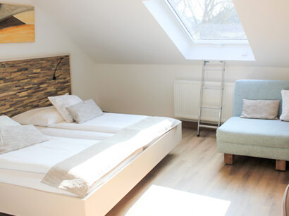 Drei Gäste finden in unseren modernen Dreibettzimmern genug Platz zum Wohnen und Schlafen.